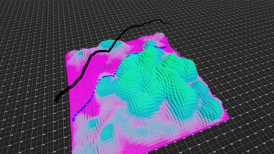 Calculate 3D paths that consider terrain elevation. Agents prefer valleys and gradual climbs over direct mountain crossings, producing natural-looking flight paths.