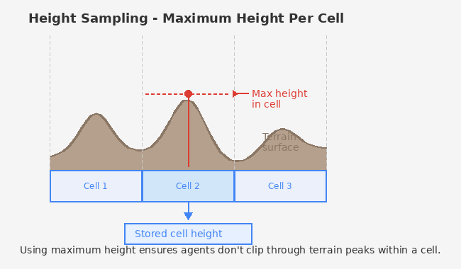 Using maximum height ensures agents don't clip through terrain peaks within a cell.