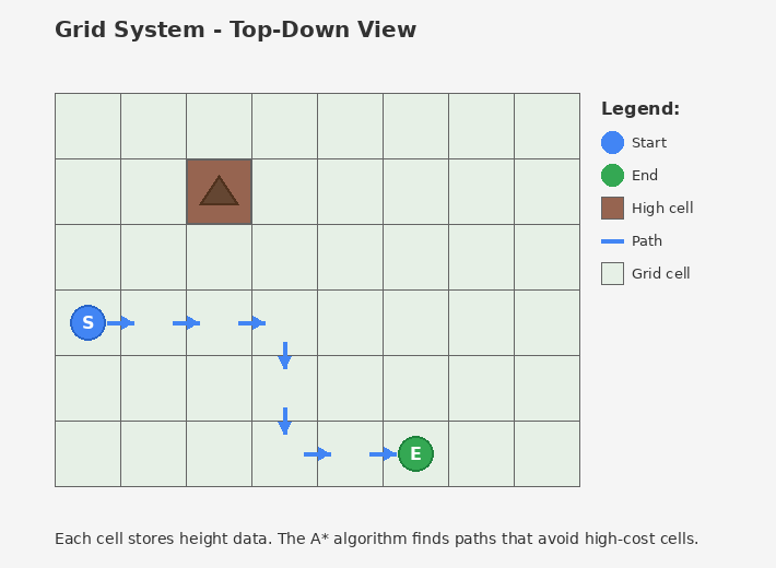 The pathfinding grid is a 2D array of cells overlaid on your 3D terrain. Each cell stores: