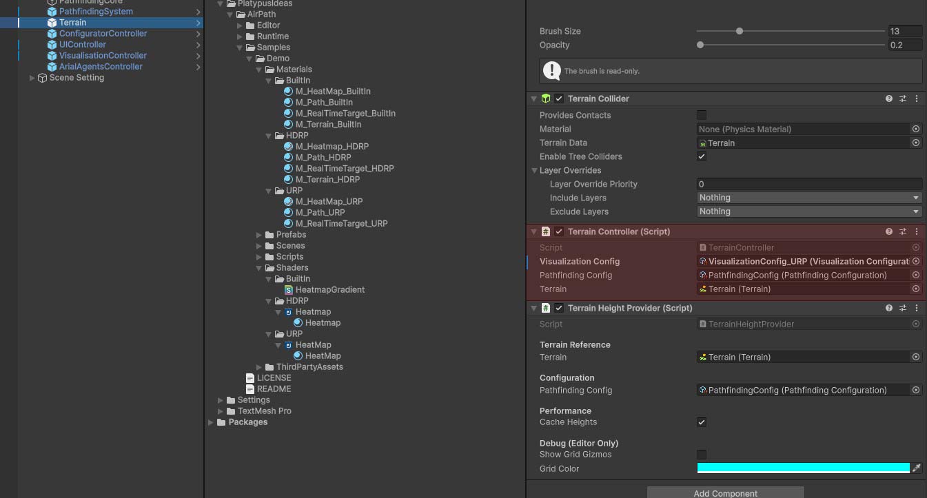 If you're integrating AirPath into your own project and already have terrain management in place, you only need to ensure that a TerrainHeightProvider is configured. The visualization features from TerrainController can be useful during development but should typically be disabled or removed for release builds.